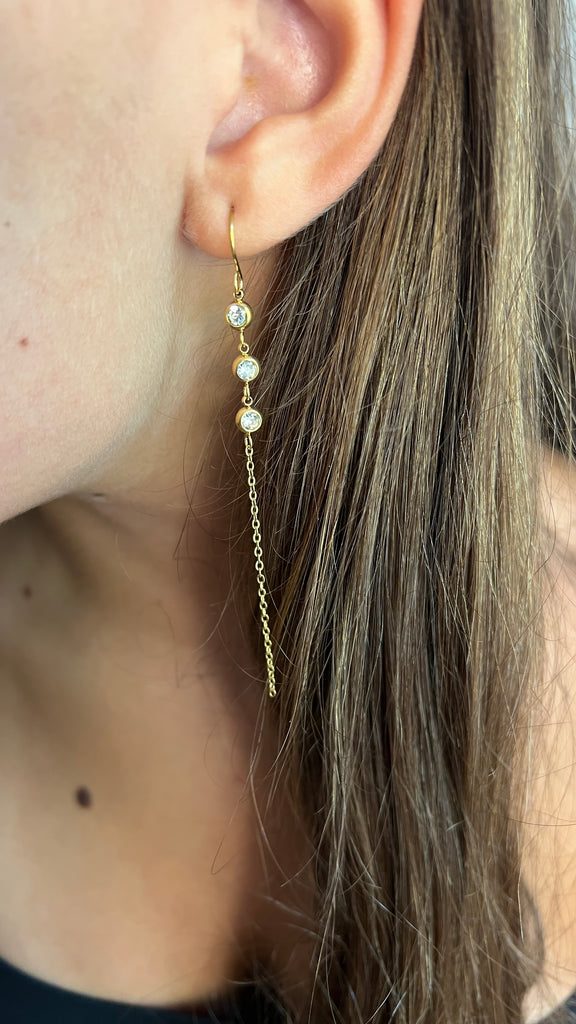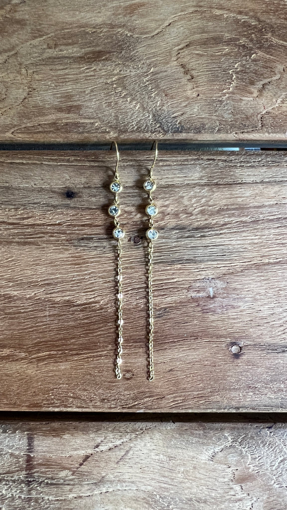 Pendientes largos con tres circonitas y cadena colgando. Cierre tipo anzuelo.